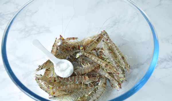 2蝦中放入一大勺鹽,再把蝦沖洗一下。如果您是用小河蝦,那就在鹽水中養一下,可以排盡裡面的臟東西。我用的是我們當地產的基圍蝦,蝦體內非常幹凈,所以隻需洗一下就可。