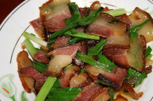 4、炒鍋坐火,待鍋燒紅後倒入切好的臘肉片煸炒,等到鍋內的臘肉變的透明後加薑末翻炒一會,滴入幾滴白醋,提香,催熟。