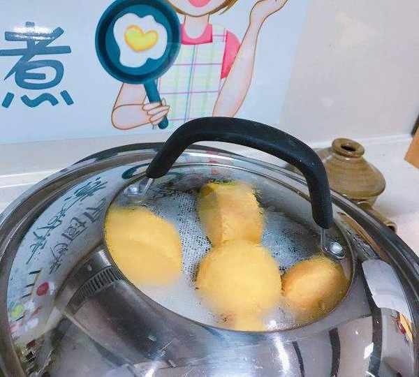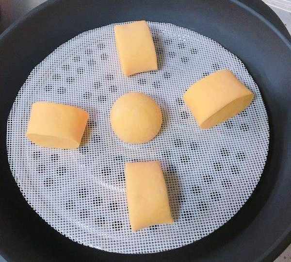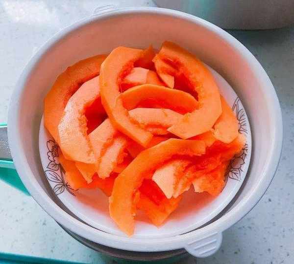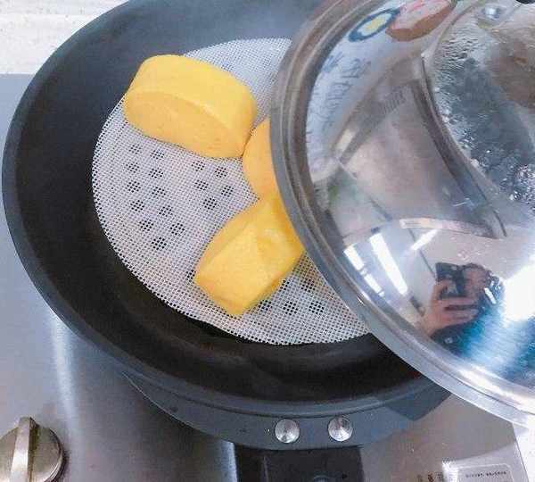 第2步、南瓜去皮去瓤,洗凈切片,上鍋蒸熟。