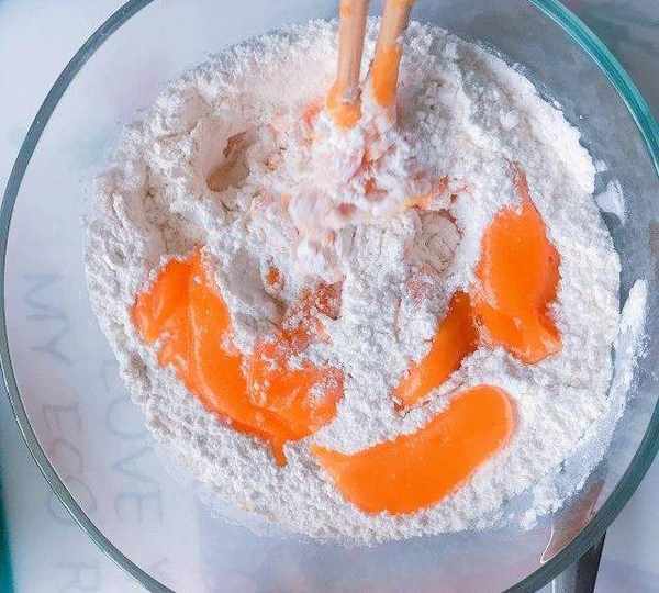 第4步、酵母倒入面粉中攪勻,也可以放在南瓜泥裡,兩者都可以的。