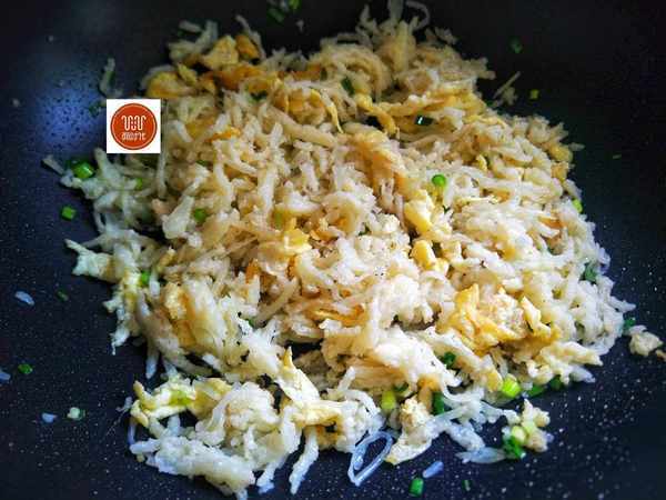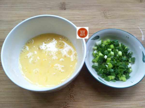 3、2個雞蛋打散,1根小蔥洗凈切成蔥花,炒鍋加適量的油先把雞蛋炒散。