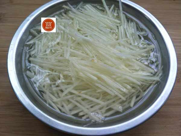 做法:1、土豆去皮,切細絲,用水泡去多餘淀粉,撈出瀝幹水份。