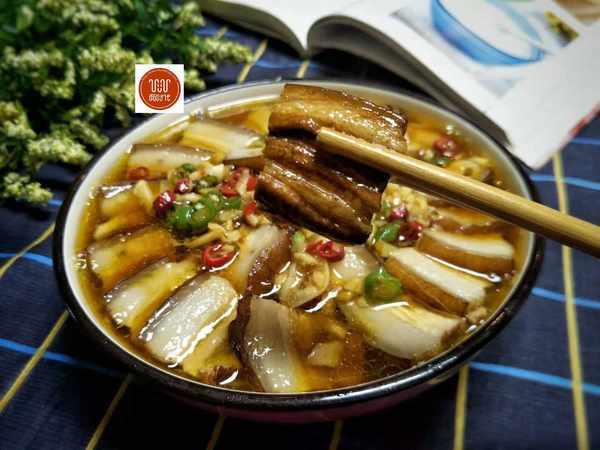 做法:1、方形帶皮五花肉一塊放入煮鍋中,蔥打結,薑片,老抽幾滴,料酒1勺,大火燒開,半小後用筷子紮透撈出,煮好的肉放涼,切片。