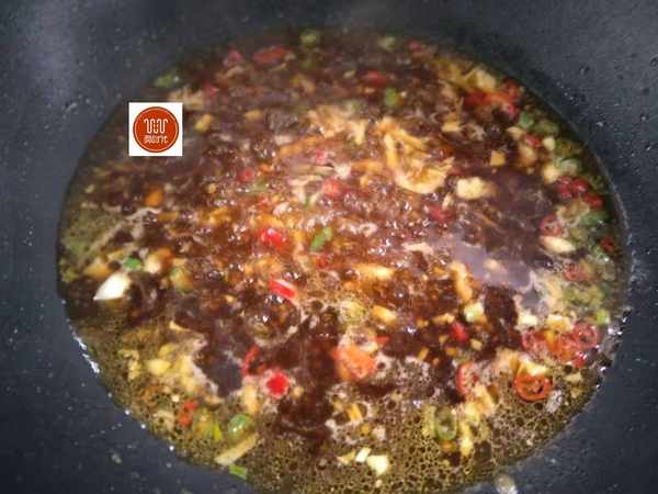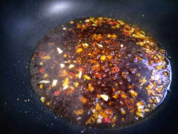 4、蒸好後盤中會有湯汁,將湯汁倒入小碗中,加少許蒜末,生抽,淀粉,紅辣椒碎拌勻,鍋燒熱,倒入湯汁煮開,將煮好的湯汁均勻的澆在辣椒釀上面就可以瞭,超級下飯哦,當然腸胃不好的人,就不要吃的太多瞭。