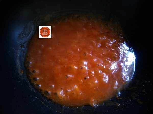 3、把準備好的西紅柿去皮切碎,起油鍋,把切好的西紅柿放入鍋中用小火翻炒,在翻炒西紅柿的時候全部都給壓碎,之後再加入蠔油生抽翻炒幾遍,然後再把我們剛剛用冬瓜汁調好的淀粉水倒入鍋中,翻炒到粘稠狀的時候就可以關火瞭。