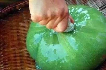老爺爺說為瞭讓做出來的仙草更有Q彈,他在裡面加瞭現磨的粳米粉,將這攪拌均勻的仙草汁放在一個大盆中晾涼讓它凝結成凍將它倒扣在竹編的容器中瀝幹多餘的水分即可食用。