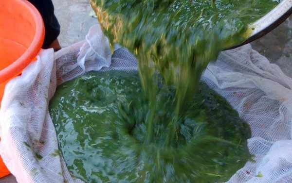 煮化開的仙草汁液濃稠,還有一些煮不化的枝幹,需要用一塊紗佈將煮不化的枝幹過濾出來,將過濾的汁液倒進一個幹凈的桶中,進行第二次加工。紗佈中的汁液可以用清水反復沖洗將汁液。