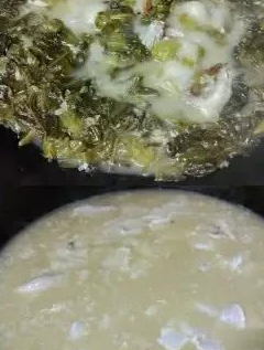 第八步,將煮好的魚骨跟酸菜撈出放入碗中墊底,然後再次燒開魚湯,將醃制好的魚片,放入下去入鍋中,用筷子將魚片打散。