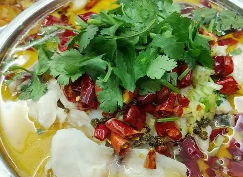 第十步,將蒜末撒在魚片之上,然後起鍋加入適量的食用油,油溫燒熱後,放入花椒和紅幹辣椒炸一下,然後將鍋中熱油澆在,魚片之上即可,最後撒上適量的香菜末,就可以開吃瞭。