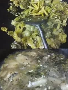 第六步,起鍋倒入適量的食用油,油熱以後放入蔥薑軟蒜末爆香,然後倒入泡酸菜,泡辣椒翻炒,再將煎好的魚頭魚骨之類倒進去,倒入適量的泡辣椒水,適量的骨頭湯,大火煮開鍋。