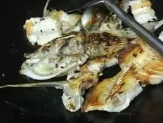 第五步,起鍋燒油,油溫五成熱時,將醃制好的魚頭魚骨,入鍋煎至兩面金黃色時,盛出來備用。