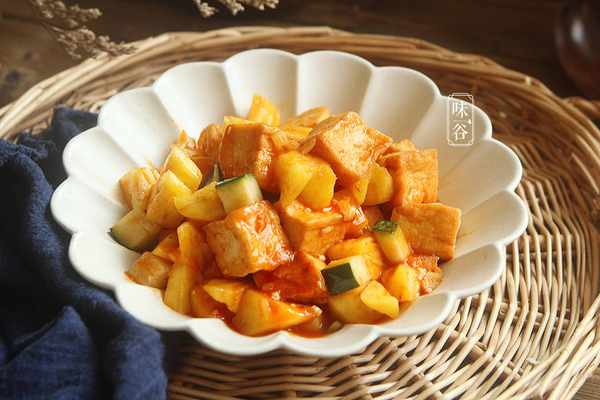 3、碗裡倒入番茄醬、白糖、鹽和水淀粉拌勻,倒入熱鍋中煮至濃稠,然後下豆腐塊、菠蘿和黃瓜大火翻炒,所有食材翻拌均勻即可出鍋。