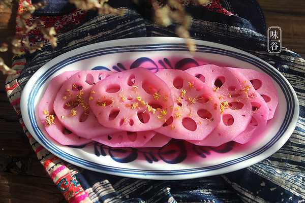 3、另起鍋,我們把紫甘藍汁倒入鍋中,咱們中小火給它熬開,撇去浮沫後過濾放入碗中,然後擠入檸檬汁輕輕攪拌,紫色瞬間變成粉紅色,開始調味,放入鹽、白糖、蘋果醋。再把過涼的藕片吸幹水分,放入紫甘藍汁裡浸泡上色即可。