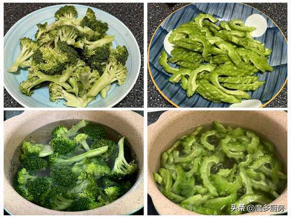 2、燒開水,把西蘭花和苦瓜分別焯水,撈出瀝水備用;