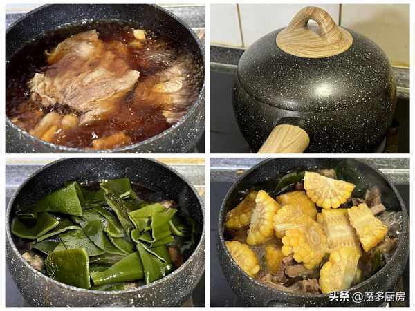 4、燉煮至牛肋排軟爛,再放進泡過的海帶塊和切好的玉米段,繼續燜煮20分鐘左右;