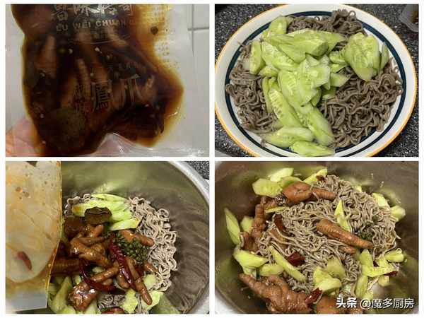 【原料】:藤椒鹵雞爪1袋、黃瓜1根、蕎麥方便面2包;