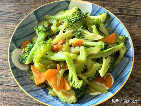 【原料】:苦瓜1根、西蘭花半朵、胡蘿卜適量、生抽醬油、食用油。