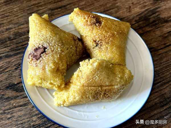 最後的主食,就是大黃米粽子的。樣子不太好看,是我自己包的。大黃米沒有泡,有豆沙餡和紅棗餡兩種,煮的時候一定要時間長,我用小火煮瞭一晚上,吃之前再加熱,個人感覺口感不錯。