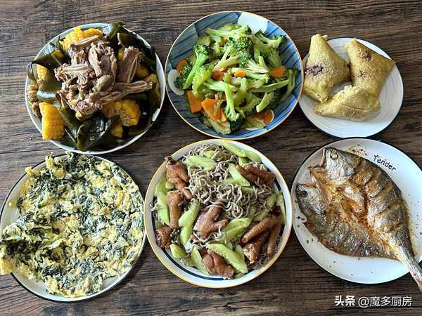 就著傢裡的食材,做瞭四個菜,兩份主食,也可以說是五個菜一份主食。有雞有魚、有肉有雞蛋,有大女兒愛吃的面條,也有小女兒愛吃的粽子,這夥食看著還不錯吧!