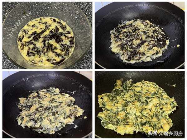 4、炒鍋燒熱,放食用油,倒入紫菜蝦皮蛋液。剛開始不要動,等到底部定型後再翻面,兩面攤熟即可出鍋裝盤。