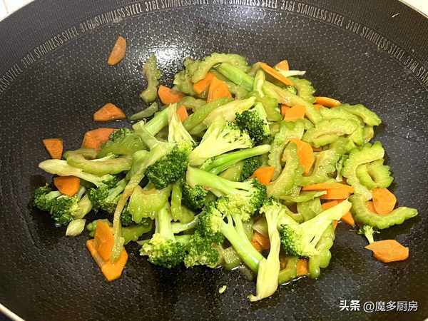 3、炒鍋上火燒熱,放食用油(如果有蒜的話,可以放點蒜碎炒香),放胡蘿卜片翻炒後,再放焯過的西蘭花和苦瓜翻炒均勻,放少許生抽醬油調味,即可出鍋裝盤。