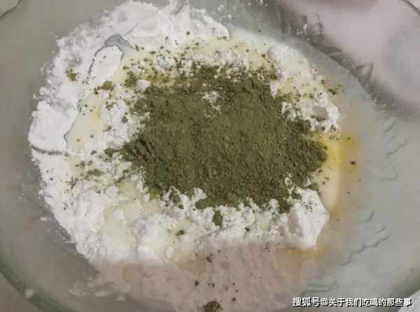 2、打入一個雞蛋,放入一勺抹茶粉,用筷子攪拌均勻。