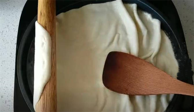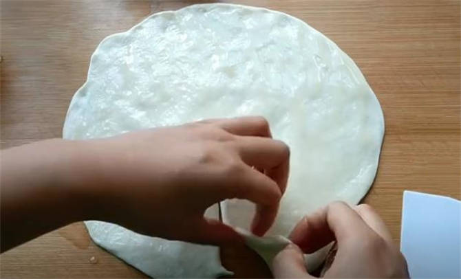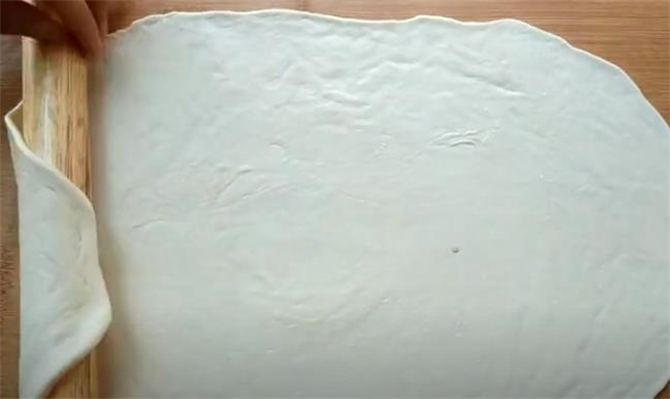 9.搟成2-3毫米厚的橢圓形面皮,用搟面杖卷起。