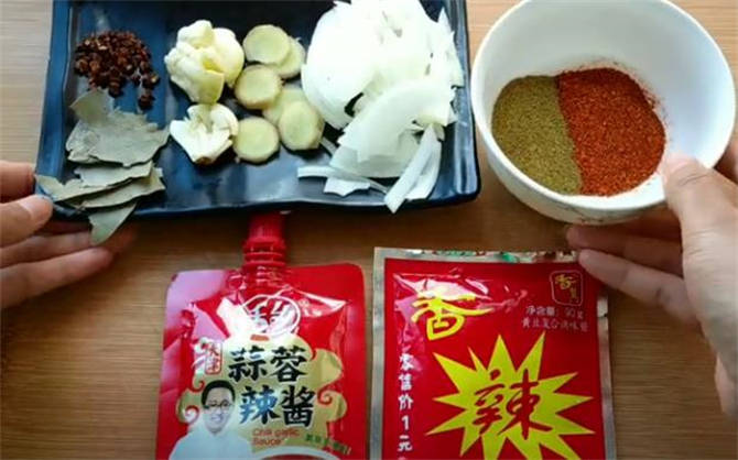 2.接下來準備醬料,蒜蓉辣醬一袋,香其醬一袋,如果找不到香其醬的話,可以用其他比較細膩的味道咸一些的醬料來代替,再準備孜然粉和辣椒粉,細膩一點的顆粒,然後準備一些蔥薑蒜切大塊,花椒和香葉備用。