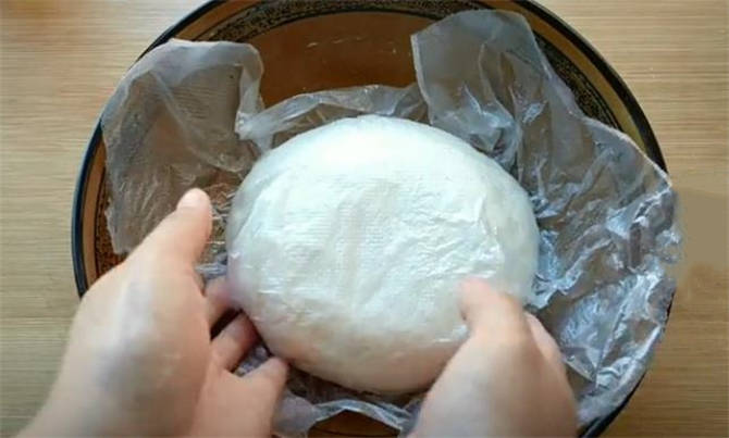 8.捏合邊緣和底部,底部輕輕的捏合即可,大頭朝下按扁,這樣生胚就做好瞭,這種做法的餅胚搟好之後特別平整,容易刷醬料,做好的餅胚蓋上保鮮膜二次松弛10分鐘之後,這樣餅更容易搟開而且更加柔軟。