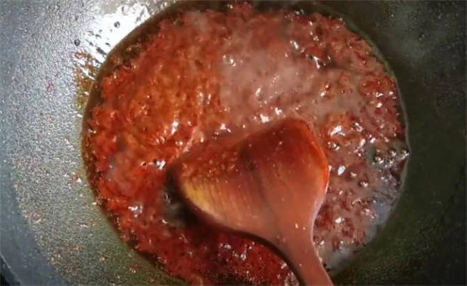 4.關火倒入孜然粉辣椒粉炸出香味,因為油溫太高的話這兩種細粉容易炸糊,然後倒入香其醬和蒜蓉辣醬熬制,開火加入素蠔油,味精,然後再加入適量的清水稀釋,像這種粘稠程度就可以,如果太幹的話醬料在餅上不容易刷開,口感會太咸。