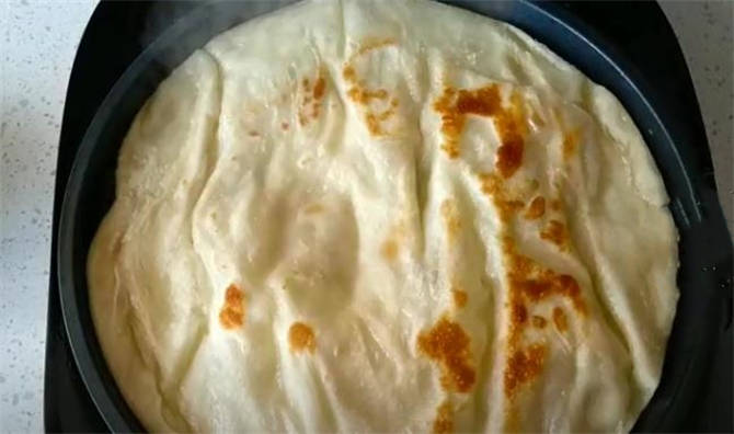 11.開蓋刷油翻面,由於這個餅特別的薄,大傢可以看到這個時候的側邊已經熟瞭,然後我們蓋上蓋子再燜30秒,這樣做是使餅更加的酥脆。