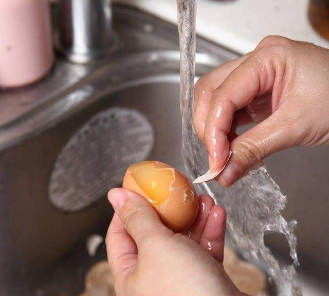 在流動的水下,順著冷凍蛋的裂痕處剝除蛋殼,再將冷凍蛋切半。