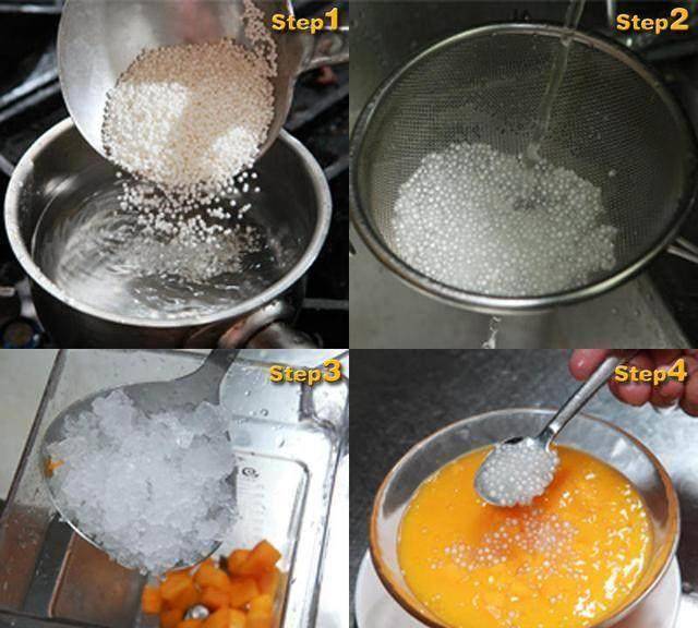 將芒果泥倒入碗中,再放入西谷米就完成瞭。