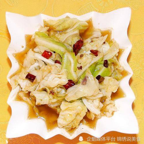 食材:圓白菜250克,花椒5克,薑、幹紅辣椒適量,白糖1小勺,食鹽1小勺,香醋、生抽、食用油適量。