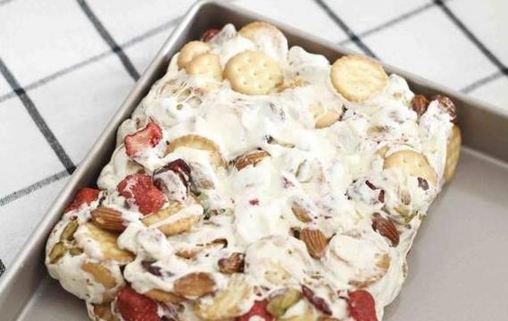 相信不少女生都想把這道點心做給傢人或者愛人品嘗,那麼今天就教大傢一種傢庭版本的雪花酥,保證你吃一口就能感受到幸福,擔心自己吃太多會發胖。首先我們要準備一些配料,包括棉花糖150g、黃油45g、奶粉45g、堅果150g、幹果30g,隻要這些東西基本上就齊全瞭。在這裡水果就不加瞭,因為制作難度較大。