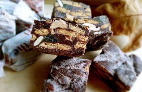 第一步我們先將堅果進烤箱,在170度的溫度下烤大約10分鐘,同時在平底鍋內用小火將黃油融化,之後加入棉花糖,等棉花糖融化後又加入奶粉攪拌;第二步,關火後將紅棗、核桃等幹果和烤箱裡的堅果倒進熱鍋,與棉花糖和奶粉攪拌均勻,然後壓成長方體的模型,切成片。一個簡易版本的雪花酥基本成型,記住還要在表面撒上一層奶粉。