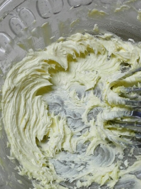 3.黃油軟化以後,加入糖粉和鹽,用打蛋器打發,到體積稍微膨大,顏色稍變淺,呈膨松狀