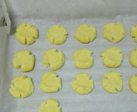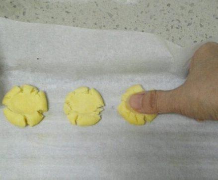 9.將小圓球放在烤盤上,用大拇指按壓,餅幹會出現自然的裂紋