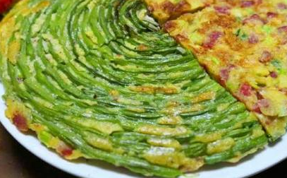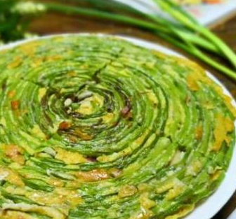 奶奶雖然年紀大瞭但是還不愛閑著,這是奶奶種的豆角做的餅。豆角豐收的季節,炒豆角甚至是酸豆角大傢都吃膩瞭,奶奶就想瞭一個辦法,走早餐餅,把豆角洗幹凈之後不切斷,一根根的繞著繞起來。調面糊,面糊裡面放雞蛋,鹽和炒菜料,面糊調的稠一點,最後均勻的撒在盤好的豆角上面。最後放進電餅鐺裡面煎熟就可以瞭。