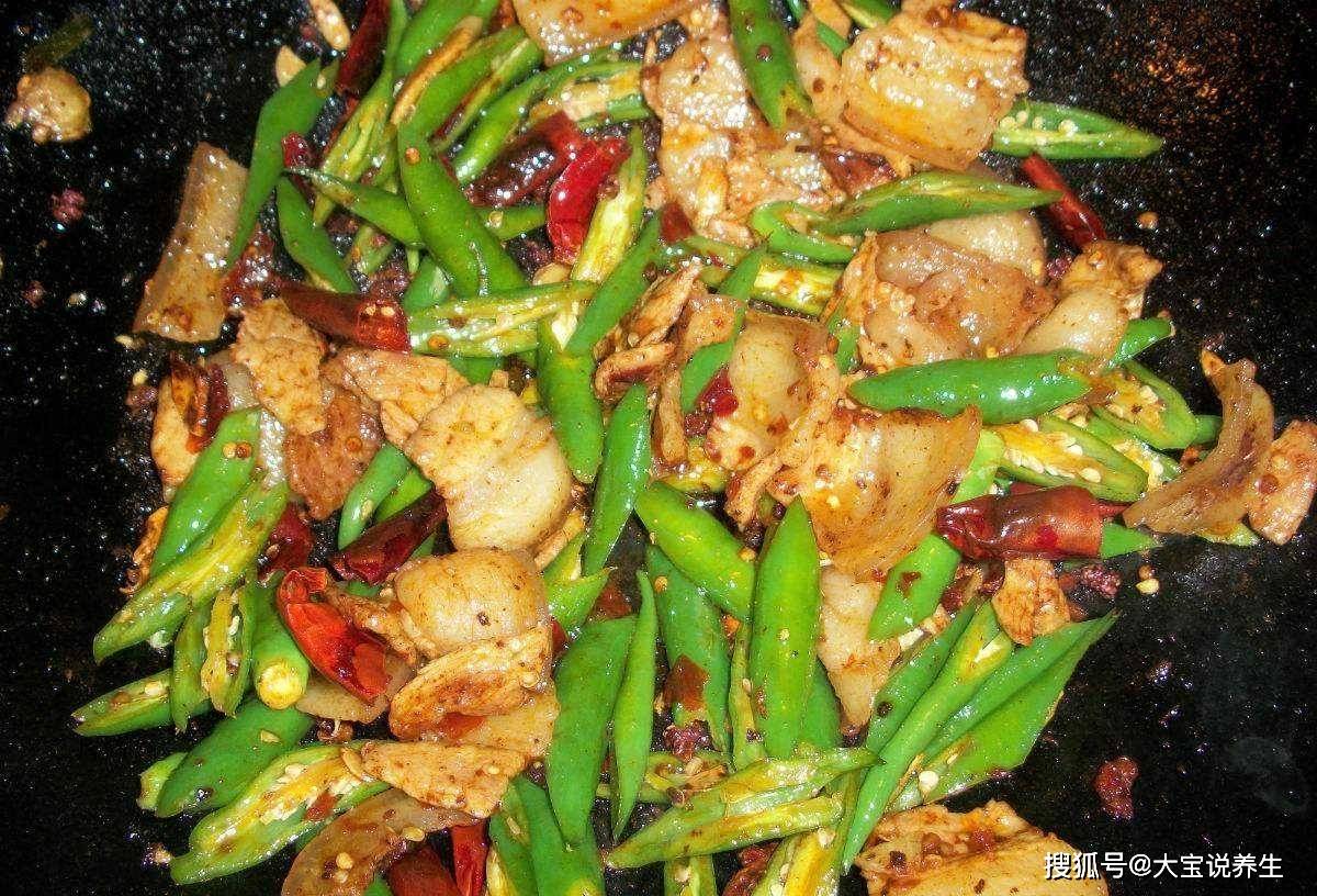 將煮好的五花肉用冷水浸泡片刻,然後瀝幹水分切薄片,鍋中油燒熱,放入五花肉片下油炸,炸至肉質透明凝固。擱置一旁,再加入蔥薑蒜爆香,再加入豆角和紅幹辣椒爆香至油狀。