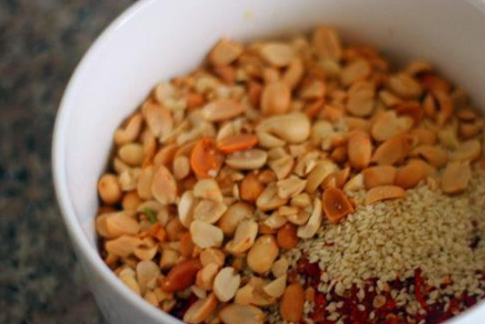 這個辣椒油還是請教我一個廚師朋友才做成功的。做法是這樣的,準備花生炒一下,去掉皮。假如沒有炒熟的花生。也可以用烤箱代替。八角,香葉,花椒等香料,要提前準備好。再把蔥切成段。鍋裡放油,然後放入各種香料,還有蔥。然後開中小火,火候不能太大,花生做成花生碎,然後把花生碎辣椒粉還有熟的芝麻,放在一個容器裡,放鹽攪拌均勻,然後把各種香料從油裡撈出來,潑在辣椒粉上。滋啦一聲,那叫一個香。涼瞭之後裝瓶儲藏。隨吃隨開。