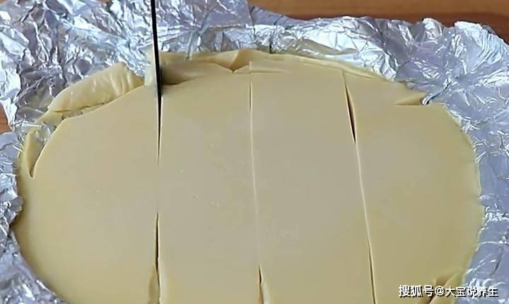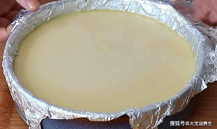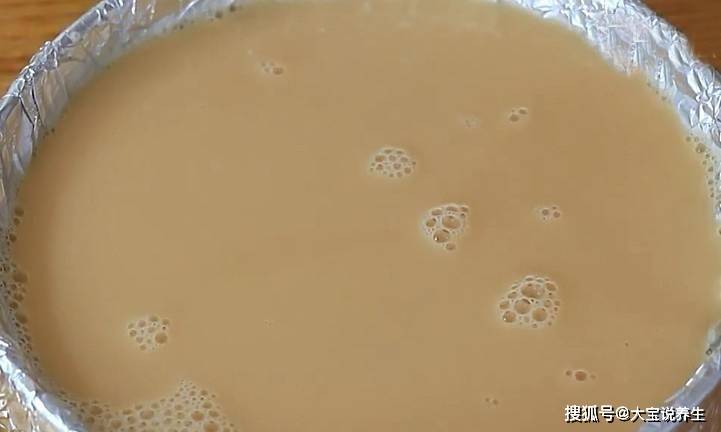 第三步:在碗裡鋪一層錫紙,把混合好的豆漿和蛋液過濾到錫紙裡,去掉表面的泡沫,蓋上一層保鮮膜,在上面戳幾個洞。保鮮膜。