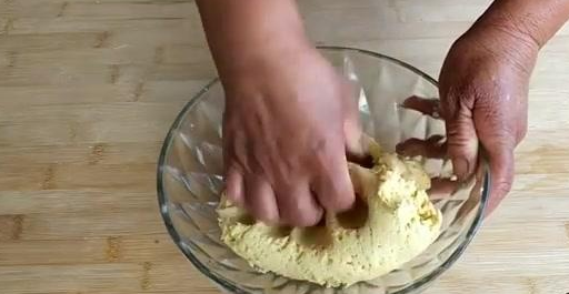 然後我們用手把它搓的長一點,拇指在底部戳一個洞,一邊按壓調整一邊轉動我們的窩頭。