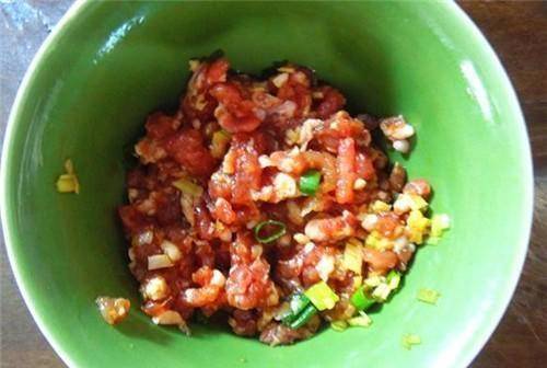 第一步:首先,將買來的肉清洗幹凈,放入盆中洗凈。將清洗幹凈的肉放在案板上開始切,直到肉末放入碗中。同時,將蔥、薑、蒜切碎,加入肉末中,倒入半茶匙鹽、5毫升醬油、5毫升料酒,攪拌均勻後醃制10-15分鐘分鐘。