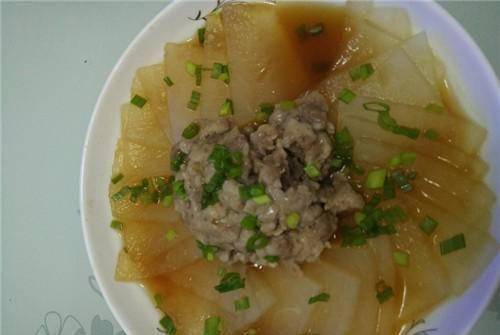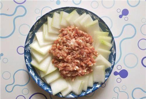 第二步:等待期間,取出一小塊冬瓜,用刀將冬瓜皮剝去,簡單清洗一下,然後將冬瓜切片。然後準備一個盤子,把冬瓜放在盤子裡,肉末放在盤子中間就可以開始蒸瞭。