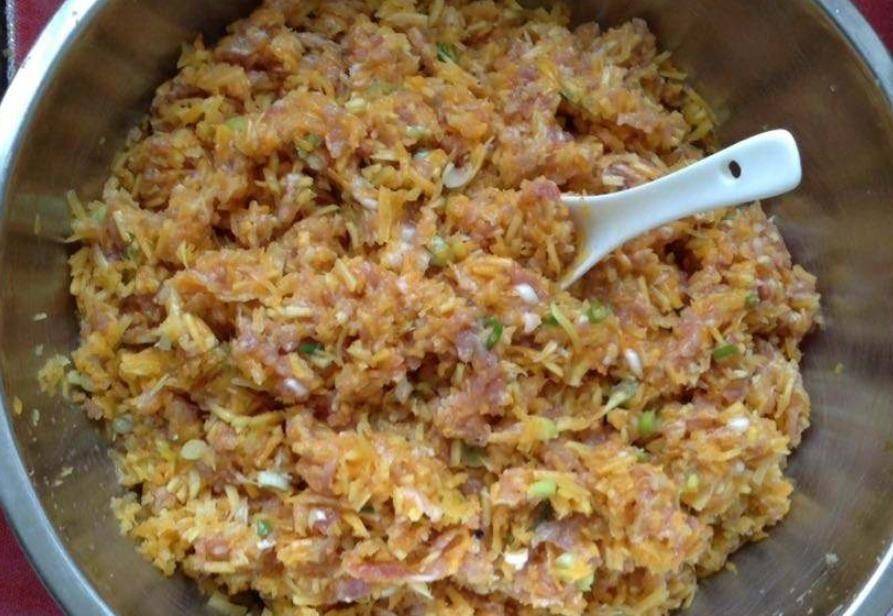 第三步:將醃制好的肉餡倒入南瓜中,加入適量的鹽、香油、食用油,攪拌均勻即成餃子餡。