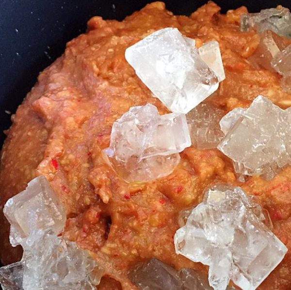 3.山楂泥和冰糖一起放入鍋中小火加熱,加熱期間要一直攪拌(以免糊鍋),熬制粘稠就可以