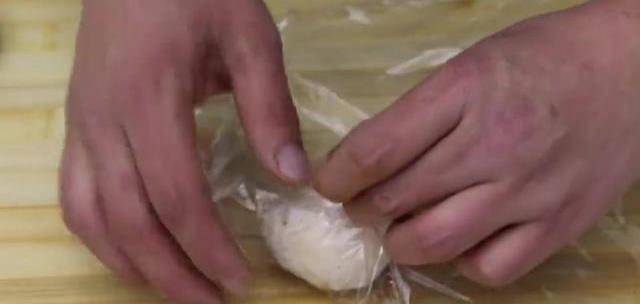 雞蛋徹底晾幹水分以後,準備一個空碗倒上食鹽,先把食鹽裡面的疙瘩捏一下捏碎,再放一點十三香,再放一小把花椒,然後抓拌均勻,在準備一個空碗倒入一點高度白酒,雞蛋晾幹水分以後先沾一點白酒,然後再蘸上一層鹽,按照整個步驟把所有的雞蛋裹上鹽,全部做好以後準備一點保鮮膜,用剪子剪成一塊一塊的,盡量減得大一點,不要太小,全部剪好以後用保鮮膜把雞蛋包裹起來,全部給他包緊。