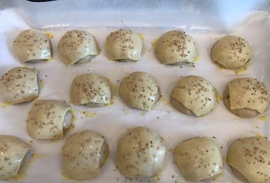9.將解凍的雞蛋刷在酥皮上,撒上白芝麻,放入烤箱烘烤約15-20分鐘或至酥皮呈金黃色。從烤箱中取出後,在烤盤上冷卻5分鐘後再食用。
