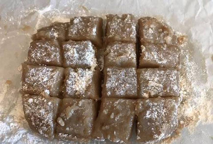 4.從楓糖漿中取出冰淇淋餡。到這個時候,楓糖漿餡就像一塊粘糊糊的冷蛋糕。在楓糖漿餡和切刀表面撒上少許低筋面粉,將楓糖漿餡分成16等份。.